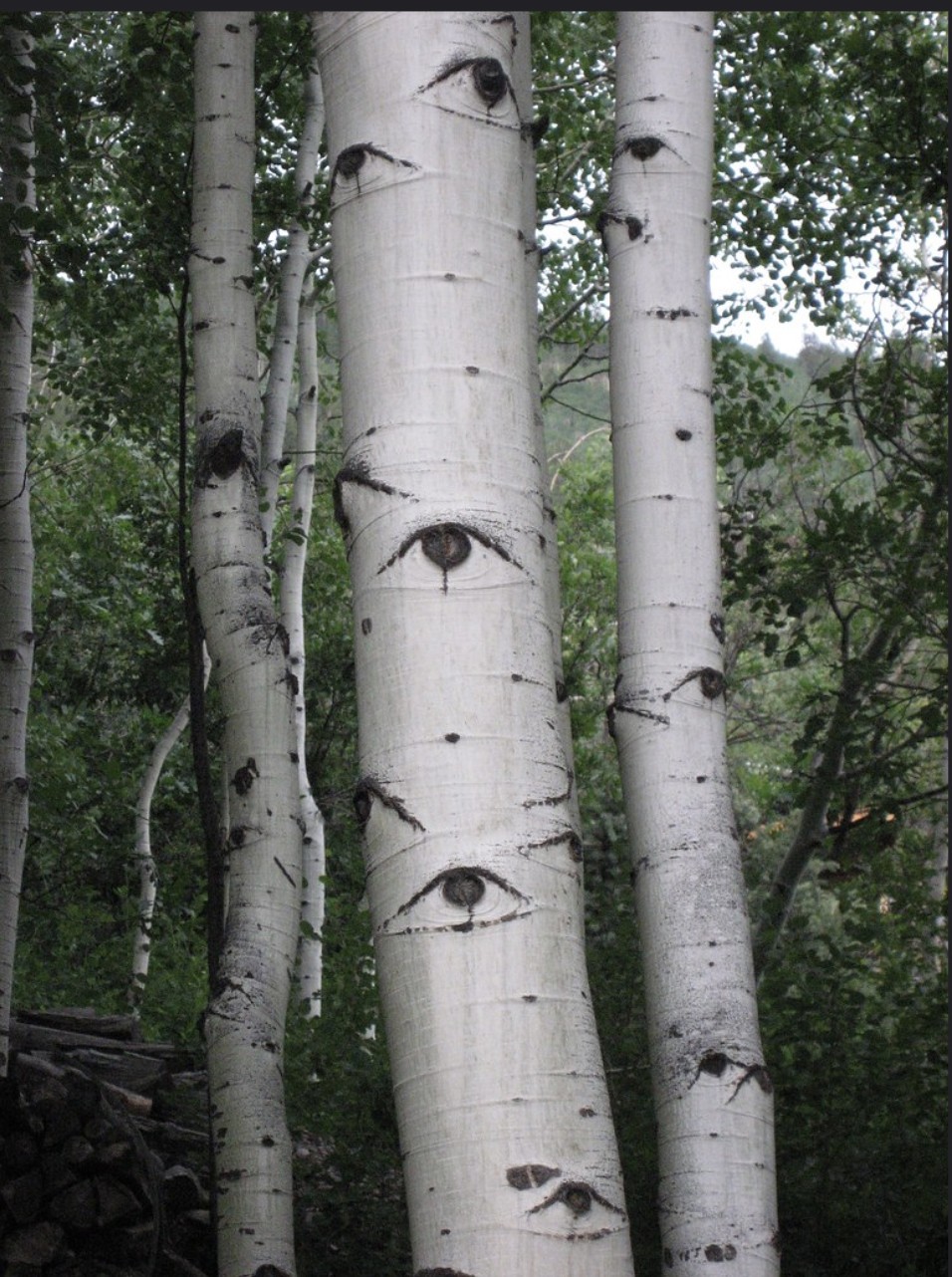 The Aspen. As the tree grows taller, the lower branches get less light and drop off forming eyes on the trunk.