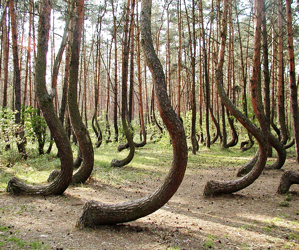 Crooked forest in West Pomerania, Poland. 400 pine trees were planted around 1930 when this region belonged to Germany. There are many theories as to why they are curved, from intentional bending for making boats and furniture to snowstorms forcing the trees to grow crooked.